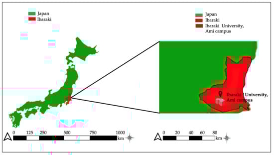 The research site is located at the Center for International Field Agriculture Research and Education, Ibaraki University, Ami-Japan (Figure 1) [18,49], with an annual mean temperature of 14.5 °C and an annual rainfall of 1352 mm from the start of the experimental system in 2002–2020 [50]. The soil is classified as an Andosol [51].