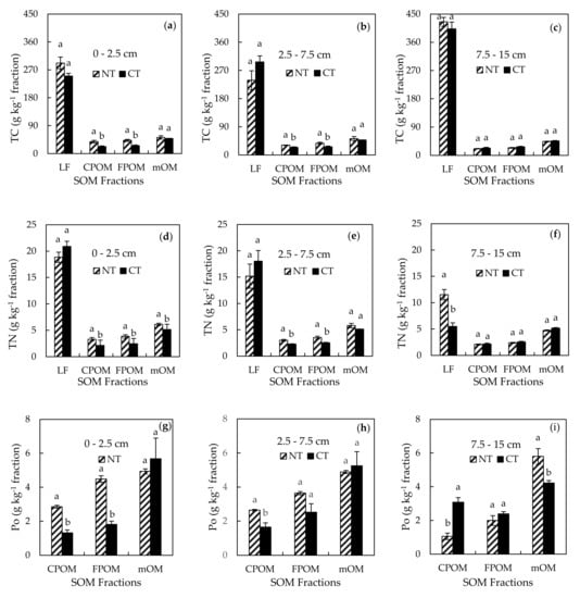 Total carbon (TC); (a–c) (g C kg−1 soil), total nitrogen (TN); (d–f) (g N kg−1 soil), and organic phosphorus (Po); (g–i) (g P kg−1 soil) of SOM fractions by physical fractionation of Andosols from the no-tillage (NT) and conventional-tillage (CT) systems. Different letters show significant differences for the tillage treatments of each fraction, according to Student’s t-test (p < 0.05).