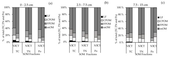 In the case of LF, the TC of LF in NT (3.12 g C kg−1) was higher than CT (1.00 g C kg−1) at a depth of 0–2.5 cm, while the TN of LF in NT (0.02 g C kg−1) was higher than CT (0.01 g C kg−1) at the 7.5–15 cm depth. Figure 4 shows the ratio of each fraction to the total fraction. The mOM fraction mainly contributed to the total TC, TN, and Po of soil (59–85%), followed by fPOM (9.4–24.6%), cPOM (5.3–14.3%), and LF (2.0–5.9%).