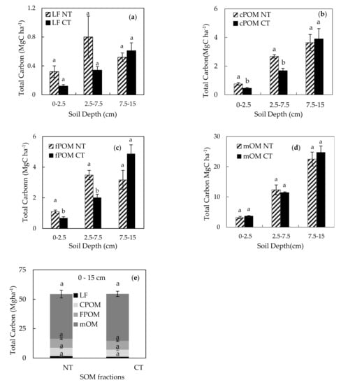 Figure 5 presents the total SOC stock (0–15 cm depth) of each fraction. The total SOC stock in cPOM and fPOM was significantly higher in NT than in CT at the surface layers (0–2.5 and 2.5–7.5 cm), while it was not the case of LF and mOM.