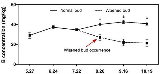 3.2. Comparison of B Concentration between Normal Buds and Wizened Buds