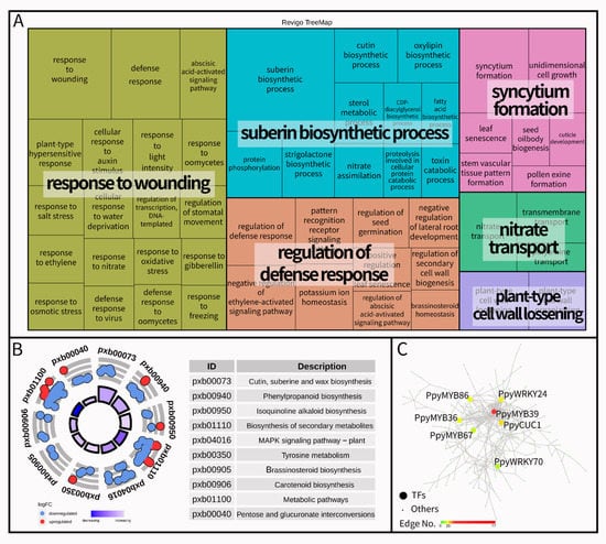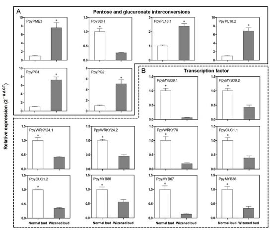 3.4. Expression Levels of Differentially Expressed Genes and Candidate Target Genes of PpyMYB39