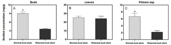 3.6. Changes in Sorbitol Content in the Buds, Leaves and Phloem Sap