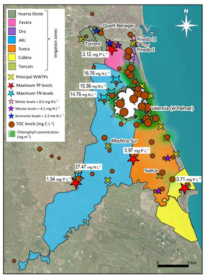 The digital covers provided by QGIS were used to integrate the results obtained from the analytical analyses and allowed a detailed spatial assessment of the aquatic ecosystems of the wetland and part of the river catchment area. Firstly, the already rich nutrient waters in the irrigation channels are mixed and enriched by effluents from different wastewater treatment plants (WWTPs), especially those located in the north. The water taken from the River Turia circulates, mixed with effluents from various WWTPs and industrial treatment plants [45,84]. The WWTPs of Quart de Benager and Pinedo had the maximum values of NH4-N and nitrite nitrogen, whereas the maximum nitrate nitrogen and TP values were also found in an irrigation ditch of this zone (Favara, Figure 2 and Figure 4). The pollution with TP was also punctual in different irrigation sectors. The maximum TN values (exceeding 14 mg N L−1) were found mainly in the northwest of the lake, in irrigation ditches used for fruit and rice crops (Figure 4), but there were also some points of high dissolved organic nitrogen in the south (Figure 2 and Figure 4). The diffuse and punctual discharges of nitrogen and phosphorus affected to the entire wetland. It is relevant that no significant differences were observed between agricultural activities, suggesting that the environmental impact depended on the water management in the wetland.