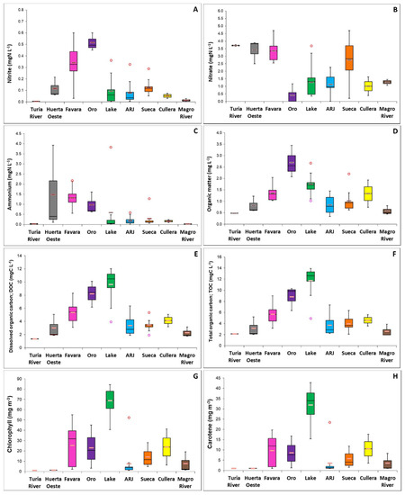 Some of the variables that showed statistical differences between the studied zones (Kruskal–Wallis test, p < 0.05). Box-plots with medians, percentiles and outlier values. (A) Nitrite, (B) nitrate, (C) ammonium, (D) organic matter, (E) dissolved organic carbon, (F) total organic carbon, (G) chlorophyll a, (H) carotene.