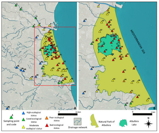 The trophic state index is commonly used to determine the trophic degree of water bodies [25]. The Water Framework Directive has water quality indicators that also take into account the complexity of each aquatic ecosystem: the human pressures to which they are exposed and the spatio-temporal variation of its physicochemical characteristics, among other features [21,26,27,28]. The most important index is the ecological potential: “an expression of the quality of the structure and functioning of aquatic ecosystems associated with surface waters” [24]. This approach is based on thresholds assigned to specific physicochemical, hydrological and biological indices [29] and allows the assessment of the chemical status of water bodies and reversing deterioration trends.