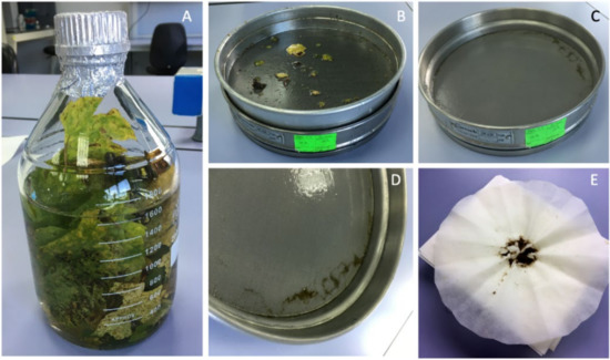 Chasmothecia obtaining process from ‘Godello’ variety grapevine leaves: (A) 100 g of chopped grapevine leaves in a 2 L bottle with 1.5 L of distilled water; (B) 0.2 mm sieve; (C) 0.1 mm sieve; (D) clean chasmothecia on the 0.2 mm sieve; (E) recovered chasmothecia by drying on a filter paper for subsequent preservation.