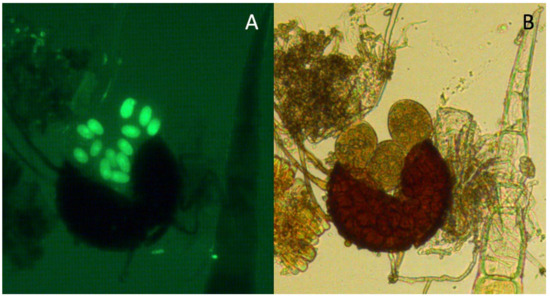 Open chasmothecia showing asci with ascospores. Both images show the result of the same preparation stained with fluorescein diacetate under (A) fluorescence and (B) brightfield microscopy (40×).