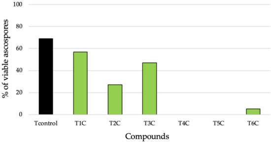 Percentage of viable ascospores after subjecting chasmothecia to treatments with the following compounds: distilled H2O (Tcontrol), chitosan oligomers (T1C), COS + silver nanoparticles (T2C), COS + ε-polylysine (T3C), COS + Streptomyces rochei secondary metabolites (T4C), COS + S. lavendofoliae secondary metabolites (T5C), and COS + hydrolyzed gluten (T6C).