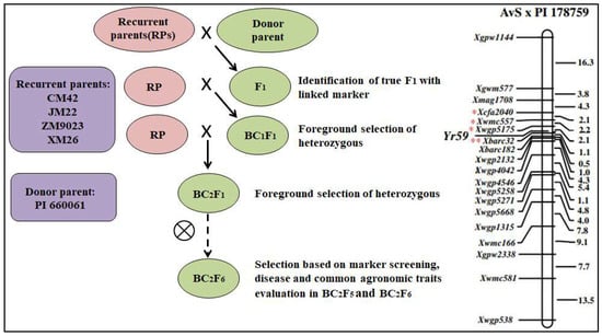 The scheme of introgressing stripe rust resistance gene Yr59 into four elite wheat cultivars through marker-assisted backcrossing (MABC). The Yr59 linkage map was adopted from Zhou et al. (2014). The marker with two asterisks (**) was used in genotyping F1, BC1F1 and BC2F1 plants, and the markers with one (*) and two asterisks (**) were used to screen the BC2F5 and BC2F6 lines.