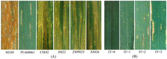 Stripe rust infection type (IT) was assessed based on the 0–9 scale [58], and disease severity (DS) was recorded as the percentage of infected leaf area for each line using a modified scale from Peterson [59]. Both IT and DS data were collected when the susceptible control MX169 exhibited nearly 80% severities around the flowering stage and again after a week. The mean IT and DS scores of the plants and between the two records were calculated and used to rate each line. IT 0–3, 4–6 and 7–9 were considered resistant, intermediate and susceptible, respectively. The DS data were also considered in the line selections.