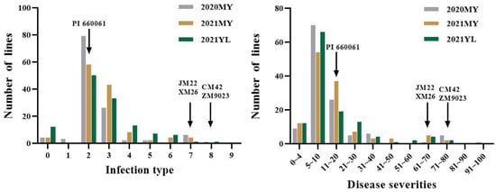 Distributions of mean infection type (IT) and disease severity (DS) for 123 Introgression Lines (ILs) from the four crosses of CM42///CM42//CM42/PI660061, JM22///JM22//JM22/PI660061, ZM9023///ZM9023//ZM9023/PI660061 and XM26///XM26//XM26/PI660061 at Yangling (YL) and Mianyang (MY) in 2019–2021. Arrows indicate the scores of the parental lines.