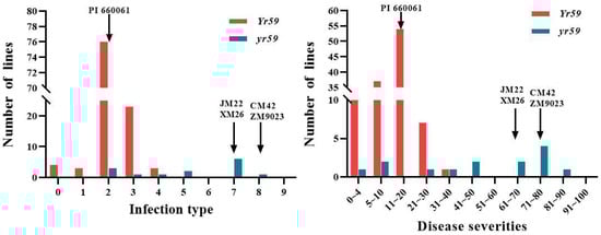 According to the reports, CM42 and JM22 have race-specific ASR genes Yr26 and YrJ22, respectively [48,49,50]. In our results, almost all lines carrying Yr59 showed high level of resistance with IT scores lower than 3 and DS less than 20%. Some lines having Yr59 together with Yr26 or YrJ22 exhibited stronger resistance than lines containing only Yr59 from crosses CM42///CM42//CM42/PI660061 and JM22/PI660061//JM22///JM22. This may because of the combination of effects from both genes. Surprisedly, the enhancing effect may also happen in the crosses of ZM9023/PI660061//ZM9023///ZM9023 and XM26///XM26//XM26/PI660061. There were several lines without Yr59 in ZM9023///ZM9023//ZM9023/PI660061 and XM26///XM26//XM26/PI660061 that displayed some levels of resistance. As ZM9023 and XM26 were less susceptible than the susceptible check (Table 4), they should have unknown resistance genes. The combinations of the unknown resistance genes with Yr59 should enhance resistance. A recent study reported that ZM9023 contains Yr29 and Yr30 for adult-plant resistance to stripe rust as well as Lr46/Sr59/Pm39 and Lr27/Sr2 for resistance to leaf rust/stem rust or powdery mildew linked to or pleiotropic with the stripe rust resistance genes, respectively [69].