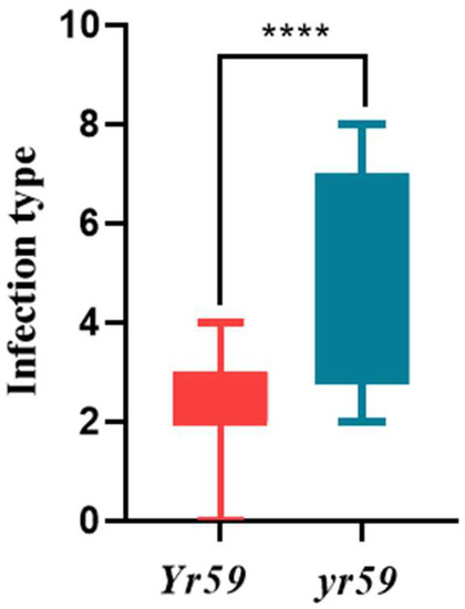 Comparison of 123 ILs for mean final infection type and disease severity about the presence (Yr59) and absence (yr59) of the stripe rust resistance gene Yr59.