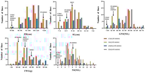 Frequency distributions of agronomic traits for the 123 ILs from the four populations. plant height (PH); spike length (SL); grain number per spike (GNS); thousand-grain weight (TGW); number of spikes (NS).