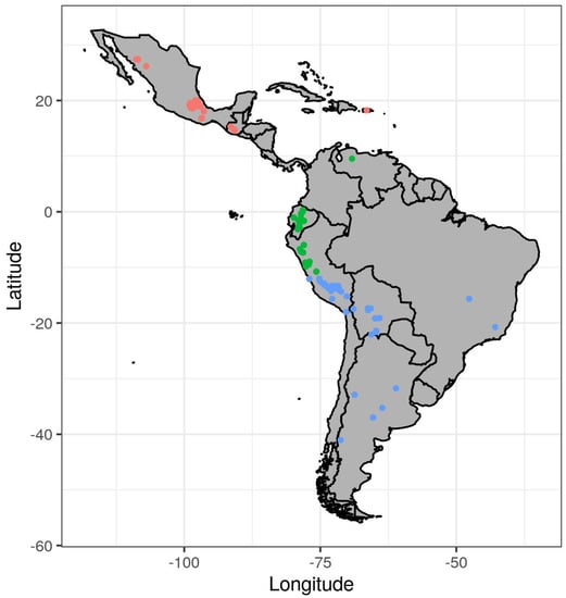 - Espitia Rangel, E.; Mapes Sánchez, E.; Núñez-Colín, C.A.; Escobedo López, D. Geographical distribution of cultivated species of Amaranthus and their wild relatives in Mexico Eduardo. Rev. Mex. Cienc. Agrícolas 2010, 1, 427–437. [Google Scholar]