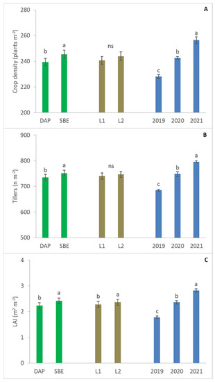 Crop density (A), tiller density (B), and LAI (C) for each applied fertilizer, location, and growing season. Error bars represent the standard error of the means; letters above the histograms correspond to the ranking of the Fisher’s protected test at p < 0.05.