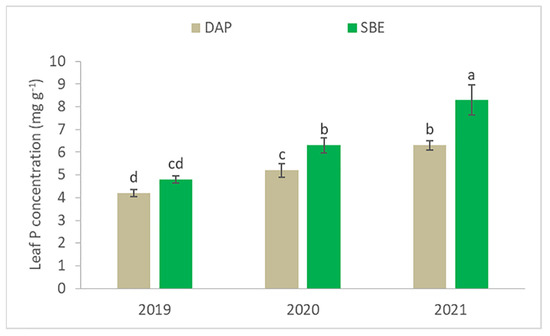 Foliar P concentration increased significantly and was nearly constantly moving from 2019 to 2021 for both fertilizers (Figure 2), but with a higher yearly rate for SBE (+30%) as compared to DAP (+20%). Moreover, while wheat plants fertilized with SBE showed a significantly higher P concentration than the DAP-fertilized plants in 2020 and 2021 (+21% and +32%, respectively), the percentage increase recorded in 2019 (+14% for SBE vs. DAP) was not statistically significant (Figure 2). Consistent with the results on aerial biomass, leaf P concentration was also significantly higher under the L2 conditions as compared to the L1 conditions (data not shown).