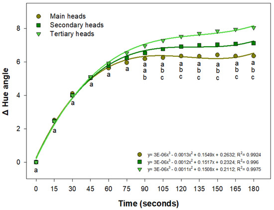 Effect of colour change (Δ Hue angle) of fresh-cut artichoke heads every 15 s for 3 min. Different letters show statistical differences (t Student test, p < 0.05) among artichoke head orders for ‘Lorca’ cultivar.