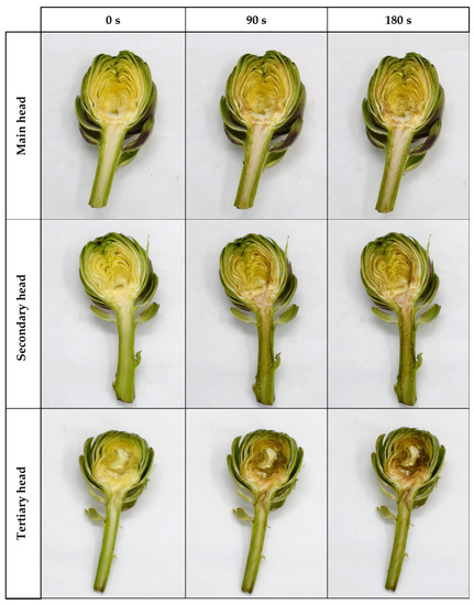 Total phenol content was correlated with the increase on hue angle variation. In general, artichokes underwent color changes after cutting, from yellow green to dark brown, which explained the decrease on hue angle over time [3,34]. Therefore, the increase on the hue color parameter, measured during 180 s, was higher for tertiary artichokes followed by secondary and main heads (Figure 2). For each artichoke head order, the results obtained were fitted to a third polynomial regression and a high correlation has been found between the increment of hue angle and time (R2 = 0.9924 − 0.9975). These differences are shown by an increase on browning process in the fresh product after cutting up to 180 s for each different flower head order, with tertiary heads being those artichokes that presented the higher color changes due to their greater phenolic content (Figure 3). These results are according to those reported previously by other authors, where a high correlation of browning score and hue angle on cut iceberg lettuce was observed [39,40]. Moreover, phenolic concentration could be directly correlated to browning susceptibility in fresh-cut artichokes since its initial high phenolic content may induce the browning reaction [41]. During the industrial processing of these vegetables, a greater impact of enzymatic browning is expected, consequently derived from mechanically damaged tissues. The browning process may be attributed to the interaction between phenols and iron due to an oxidation of iron ions and the subsequent formation of quinones catalyzed by PPO enzymes, supported by a reduction on the phenolic content [3].