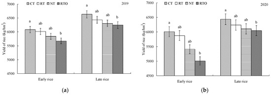 The results indicated that early rice and late rice yield with RTO treatment were lower than that of CT, RT, and NT treatments, and double-cropping rice yield with RTO treatment was significantly lower (p < 0.05) than that of CT treatment. There was no significant difference (p > 0.05) in double-cropping rice yield between NT treatment and CT and RT treatments in 2019 and 2020 (Figure 2). Compared to RTO treatment, early rice and late rice yield with CT treatment increased by 7.22% and 19.99% in 2019 and 6.19% and 6.40% in 2020. The results indicated that double-cropping rice yield with RT and NT treatments was increased, but there was no significant difference (p > 0.05) in double-cropping rice yield between RT, NT, and RTO treatments.