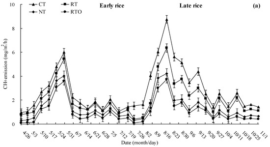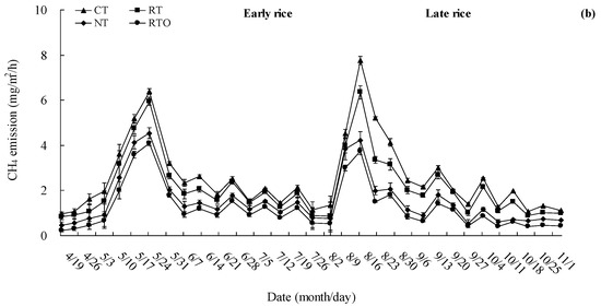 This result indicated that cumulative CH4 emission from paddy fields with RT, NT, and RTO treatments was significantly lower (p < 0.05) than that of the CT treatment. The order of cumulative CH4 emission from the paddy field with all tillage treatments (average of two years) were as follows: CT (12.03 g m−2) > RT (9.52 g m−2) > NT (6.52 g m−2) > RTO (5.14 g m−2). Cumulative CH4 emission from paddy field with CT, RT, and NT treatments (average of two years) increased by 137.28%, 86.67%, and 27.14%, respectively, compared with RTO treatment (Table 2).