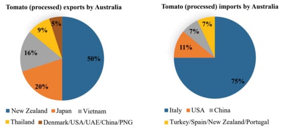 Comparison of the Australian global import and export markets of processed tomato fruits (tonnes of product). Most tomato imports come from Italy, USA and China. The tomato export market primarily consists of smaller countries geographically close to Australia such as New Zealand, Japan, Vietnam and Thailand. Data were sourced from a 2017 report [30].