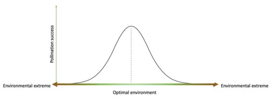 The relationship between environment and pollination success. As the environmental conditions move away from the optimum conditions, pollination outcomes rapidly diminish [46].