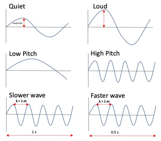 The variable properties of a soundwave. Amplitude is the maximum distance of displacement for a vibrating particle from its mean position, so as amplitude increases the volume of a sound increases (top row); as frequency increases so does pitch (middle row). Velocity is a measure of distance over a period of time (m/s), whereas acceleration is the change in velocity over a time period (m/s2). In the bottom row, the velocity of the left wave is 4 m/s, whereas the velocity of the right wave is 8 m/s. The change in speed to transition from the left to right wave would require an increase in acceleration.