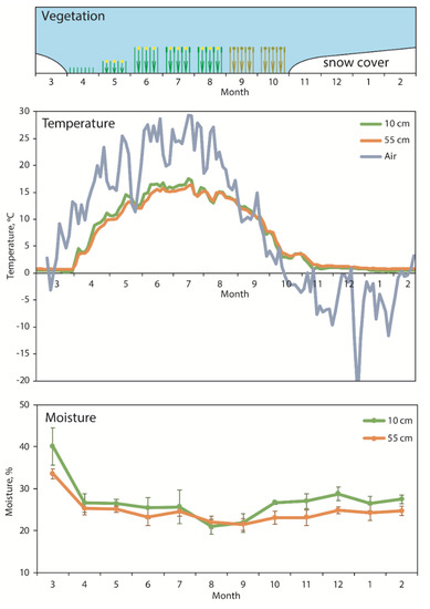 The moisture contents of the soil horizons varied from 18.9% to 45.5%, with the maximum in March, during active snowmelt, and the minimum in August (Figure 1). Throughout the year, samples of the upper soil horizon were characterized by higher moisture content compared to samples of the lower soil horizon. Snow cover was observed from November to March (in March 2017 and from November 2017 to February 2018).