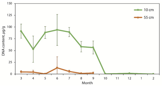 In the upper soil horizon, DNA yields varied from 37 to 114 µg g−1 dry soil from March to September. In the lower horizon, DNA yields were lower than 20 µg g−1 dry soil from March to September. For the period from October to February, DNA yields were below the detection limit (less than 0.5 µg g−1 dry soil) (Figure 2).