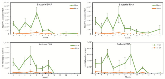 Seasonal dynamics of bacterial and archaeal 16S gene (DNA) and gene transcript (cDNA) copy numbers in soil (10 cm is the sampling depth for upper organic horizon, 55 cm is the sampling depth for lower mineral horizon).