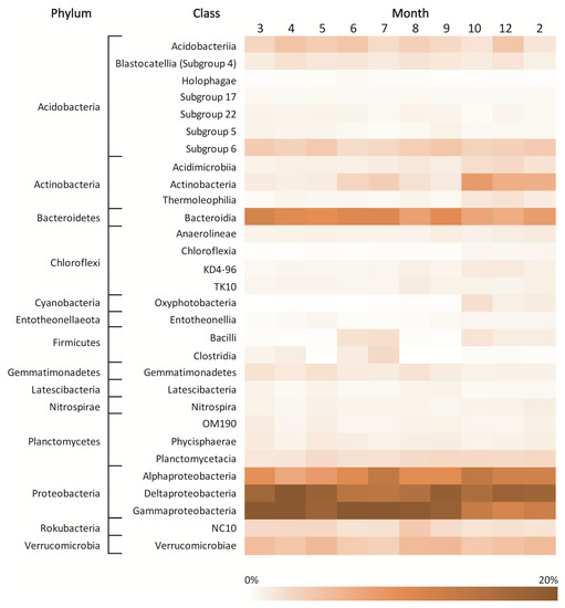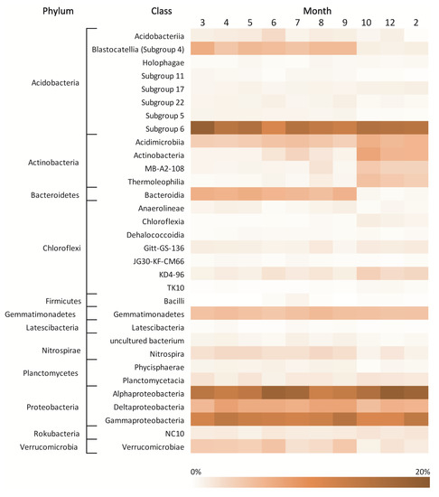 In the upper horizon, Alphaproteobacteria (up to 19%), subgroup 6 of the phylum Acidobacteria (up to 19%), Gammaproteobacteria (up to 15%) and Deltaproteobacteria (up to 8%) were the dominant classes in the bacterial community, and their abundances changed slightly throughout the year (Figure 4 and Figure 5). The bacterial community of the lower horizon was predominated by the following classes: Acidobacteriia (up to 29%), AD3 of the phylum Chloroflexi (up to 23%), Gemmatimonadetes (up to 16%), Alphaproteobacteria (up to 11%) and Gammaproteobacteria (up to 11%) (Supplementary Figure S1).