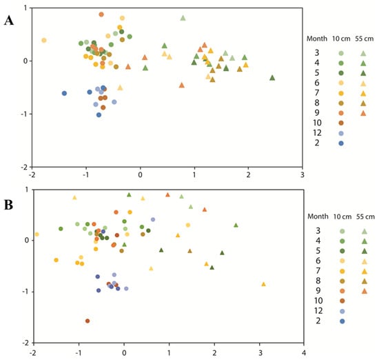 Non-metric multidimensional scaling plots of total (A) and active (B) soil bacterial community patterns in different sampling times using UniFrac (10 cm is the sampling depth for upper organic horizon, 55 cm is the sampling depth for lower mineral horizon).