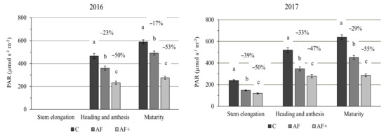 Within the moderate shade treatment (AF), the difference in PAR availability vs. the control treatment decreased during the wheat cycle, i.e., from −39% during stem elongation to −23% during grain filling (maturity), as two-year average. At the same time, the reduction of PAR in the severe shading treatment (AF+) in comparison with the open field showed small variations across the wheat cycle, ranging from −47% during heading and anthesis to −55% at maturity in 2017 (Figure 1).