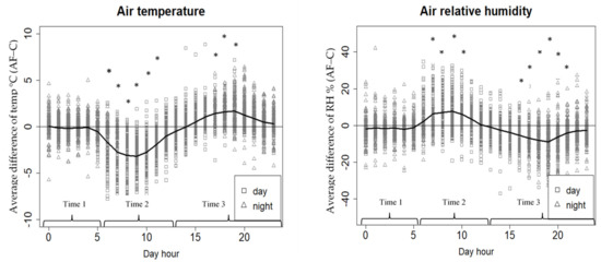 Hourly dynamics of air temperature (temp; left) and relative humidity (RH; right) recorded in C and AF treatments expressed as AF and C difference: temp.AF-temp.C (°C) and RH.AF-RH.C (%) for each hour of the day during the 2016–17 wheat growing season, from sowing to harvesting. Above the x axis, day length is divided into 3 intervals: Time1 = 12 pm–5 am, Time2 = 6 am–12 am, Time3 = 1 pm–11 pm. For each hour of the day, asterisks indicate a significant difference between values recorded in C and AF treatments (p ≤ 0.05).