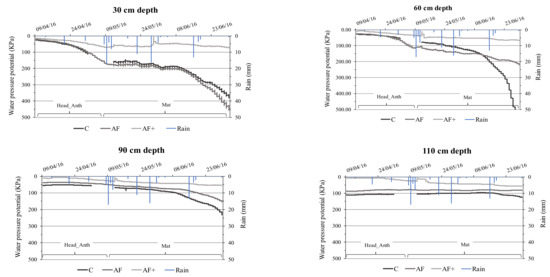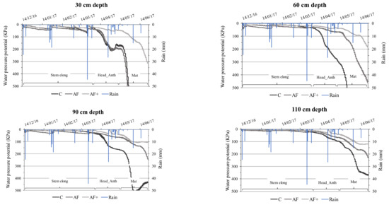 Soil water potential as hourly average pressure potential (KPa) recorded by tensiometers placed in the three treatments (C, AF and AF+) at four soil depths, i.e., 30 (top-left), 60 (top-right), 90 (bottom-left) and 110 (bottom-right) cm, during the 2nd year (2016–17) wheat growing season. Timeline in the x axis is divided into three wheat cycle periods: stem elongation (Stem elong) (from sowing to 7 April), heading and anthesis (Head_Anth) (from 8 April to 10 May) and maturity (Mat) (from 11 May to harvesting). The secondary vertical axis indicates daily rainfall (mm) within the same period.