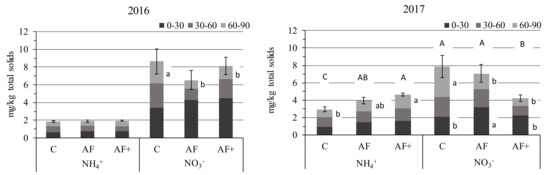 NH4+ and NO3− concentration (mg Kg−1 TS, TS = total solids; mean ±S.E., n = 13) of the soil samples collected in the three treatments (C, AF and AF+) during February both in 2016 (left) and 2017 (right). Each soil sample was divided into three subsamples according to the depth: 0–30, 30–60 and 60–90 cm. Standard error bars refer to the average NH4+ and NO3− concentration of the entire samples (0–90 cm depth). For each year and each ion, different capital letters indicate significant difference between treatments considering the 0–90 cm soil profile; small letters indicate significant difference between treatments within each of the three-soil subsample (0–30, 30–60 and 60–90 cm), according to Tukey’s HSD test (p ≤ 0.05).
