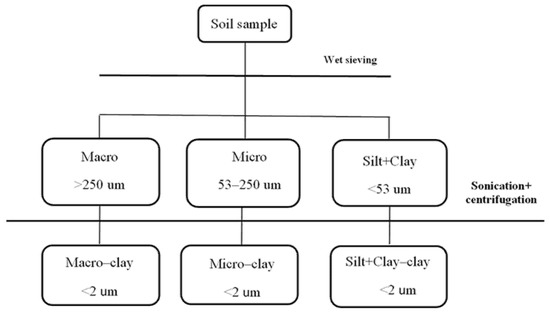 There were 3 classes of aggregates obtained: >250 μm (macroaggregates), 53–250 μm (microaggregates), and <53 μm (silt+clay) (Figure 1). Water-stable soil aggregates were separated according to the wet-sieving method described by Elliott (1986) [38]. For detailed experimental procedures, please refer to the previously published article [30].