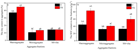 The clay contents in the aggregates under the T and TS treatments were 10.8–37.2% and 13.65–44.8%, respectively (Figure 2a). The highest clay contents occurred in macroaggregates, while the lowest clay contents were in microaggregates. TS treatment significantly increased clay contents in macroaggregates and microaggregates by 19.4% and 26.9%, respectively, compared with the T treatment (both p < 0.05). However, no significant difference between T and TS treatments was observed in the silt+clay fraction. Consequently, long-term straw incorporation was concluded to promote enrichment of clay in macroaggregates and microaggregates.