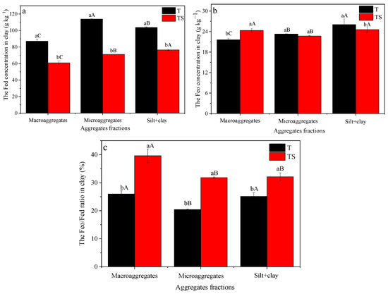 The Fed (a) and Feo (b) concentration and Feo/Fed ratio (c) in clay fractions within aggregate-sized classes under the conventional tillage without straw (T) and conventional tillage with straw incorporation (TS). Macroaggregates > 250 μm; microaggregates: 53–250 μm; silt+clay: <53 μm. Values are means ± SE, n = 3. Different capital and lowercase letters indicate significant differences between different aggregate fractions for the same treatment and between different treatments for the same aggregate fraction, respectively, at p < 0.05 according to Duncan’s multiple range test.