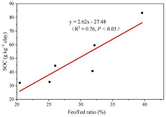 Under the T and TS treatments, the highest Feo/Fed ratio of clay was found in the macroaggregates and the lowest was found in the microaggregates (Figure 3c). Straw return significantly increased the Feo/Fed ratio of clay in all fractions (all p < 0.05). Meanwhile, the Feo/Fed ratio was found to be significantly positively correlated with SOC concentration (R2 = 0.76, p < 0.05) in the clay fractions within aggregates (Figure 4), which suggests that application of straw could efficiently activate the function of Fe oxides, thus preserving SOC.