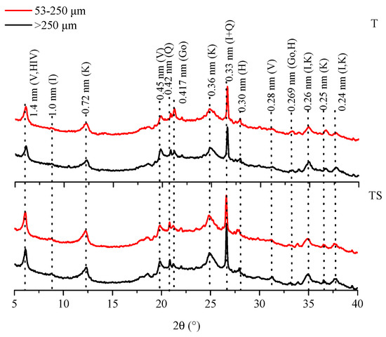X-ray diffraction spectra of minerals for clay fractions within macroaggregates (>250 μm) and microaggregates (53–250 μm) using a powder specimen slide of soil under the conventional tillage without straw (T) and conventional tillage with straw incorporation (TS). Q—quartz; Go—goethite; K—kaolinite; I—illite; H—hematite; V— vermiculite; HIV—hydroxy-interlayered vermiculite.
