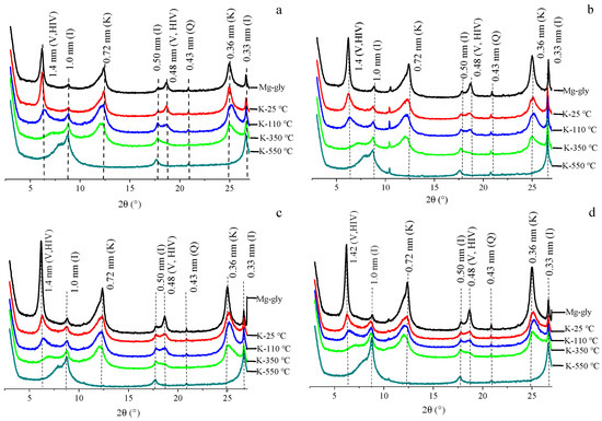 To identify phyllosilicate minerals in the clay fractions of natural soils, X-ray diffraction (XRD) was performed after removal of free Al- and Fe-oxides from the fractions by the dithionite–citrate–bicarbonate extraction method [43]. The mineralogical compositions of clay fraction (<2 μm) within macroaggregates and microaggregates were determined by random powder and oriented samples. Prior to XRD analysis, the following treatments were performed on tested samples: Mg-glycol saturation (Mg-gly) and K saturation (K). The Mg and Mg-gly samples were examined at 25 °C. The K-saturated samples were examined at 25 °C, then heated for 2 h at 110 °C, 350 °C, and 550 °C [44]. The random powders on glass slides and the oriented samples were measured by an X-ray diffractometer (D8 Advance, Bruker, Rheinstetten, Germany) with Cu Kα radiation (λ = 1.5418 Å) generated at 40 kV and 40 mA. Diffraction data were recorded in scanning mode and converted to step patterns (with a step of 2° 2θ between 4 and 40° 2θ, using a 60 s counting time per step) [45]. The mineralogical compositions of the clay fractions in the XRD patterns were analyzed using Jade software (Materials Data, Inc., Livermore, CA, USA).