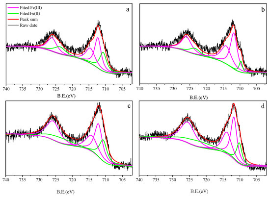 High-resolution XPS spectrum of Fe for clay fractions within macroaggregates (>250 μm) and microaggregates (53–250 μm) of soil under the conventional tillage without straw (T) and conventional tillage with straw incorporation (TS). (a) T, macroaggregates; (b) T, microaggregates; (c) TS, macroaggregates; (d) TS, microaggregates.