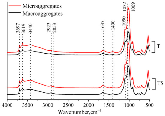 Fourier transform infrared (FTIR) spectra of clay within macroaggregates (>250 μm) and microaggregates (53–250 μm). T—straw removed; TS—straw incorporation.