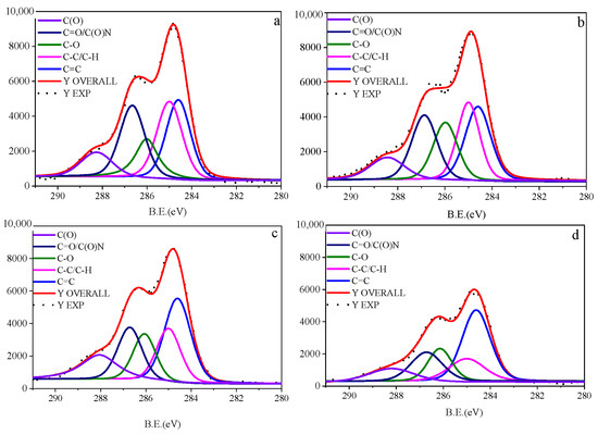 The binding energies of spectral shifts in the core level C 1s were assigned to different chemical components of C as follows: (1) aromatic-C (C=C: 284.6 eV), (2) aliphatic-C (C–C(H): 285 eV), (3) ether or alcohol-C (C–O; 286. 2 eV), (4) ketonic or aldehyde-C (C=O; 287.9 eV), and (5) carboxylic-C (C(O)O; 289 eV) [13,54].
