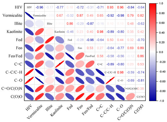 The hydroxy-interlayered vermiculite in clay fractions showed positive correlation with the amounts C–C(H) (r = 0.93) and C–O (r = 0.96 *, p < 0.05) (Figure 10), implying that the hydroxy-interlayered vermiculite preferentially binds aliphatic and alcohol organic compounds to form organo–mineral complexes. In addition, the kaolinite was significantly (r = 0.98 *, p < 0.05) positively correlated with the amounts of C=C in clay within aggregates. The concentration of Feo and Feo/Fed ratio was positively correlated with the amounts of C=C and C(O)O content in clay within aggregates.