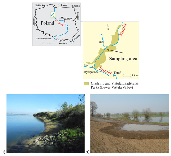 Samples of sediments and alluvial soils were collected from the Fordońska Valley within the Lower Vistula, protected area of Chełmiński Landscape Park (Figure 1). The Vistula is the longest and largest river in Poland, with a length of 1022 km. The Vistula basin covers 194,424 km2. The Vistula has been in its present shape for over the last 14,000 years, after the complete recession of the Scandinavian ice sheet from the area. The research covered floodplain areas between the Vistula channel and a flood embankment 200 m to 600 m from the river channel.