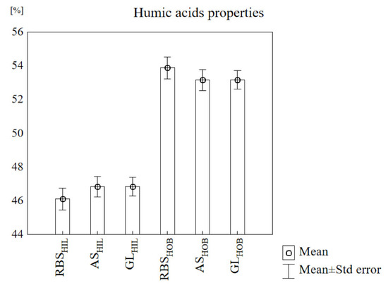 Hydrophilic and hydrophobic properties were determined with a liquid chromatograph HPLC Series 200 with a DAD detector from Perkin-Elmer, Shelton, USA. The separation involved the use of column X-Terra C18, 5 μm, 250 × 4.6 mm. The solutions of humic acids were applied in 0.01 mol/L NaOH of the concentration of 2 mg L−1; injection of the sample—100 μL; solvent: acetonitrile–water; solvents flowed into the gradient (ratio of H2O: ACN (v/v) over 0–6 min—99.5:0.5; 7–13 min—70:30; 13–20 min—10:90); and detection—at a wavelength of 254 nm. Based on the determined areas under the peaks, the share of hydrophilic (HIL) and hydrophobic (ΣHOB = HOB1 + HOB2) fractions in humic acid molecules and the parameter HIL/ΣHOB were determined [43,44,45].